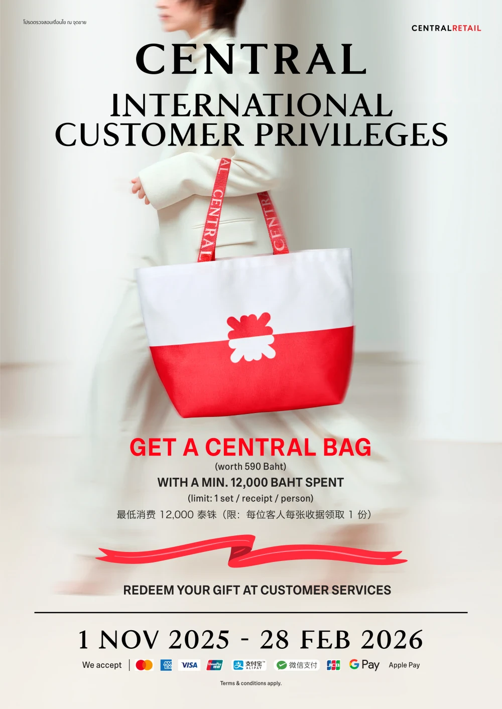 - GET A CENTRAL BAG (WORTH 590 BAHT) WITH A MIN. 12,000 BAHT SPENT (LIMIT: 1 SET / RECEIPT / PERSON)