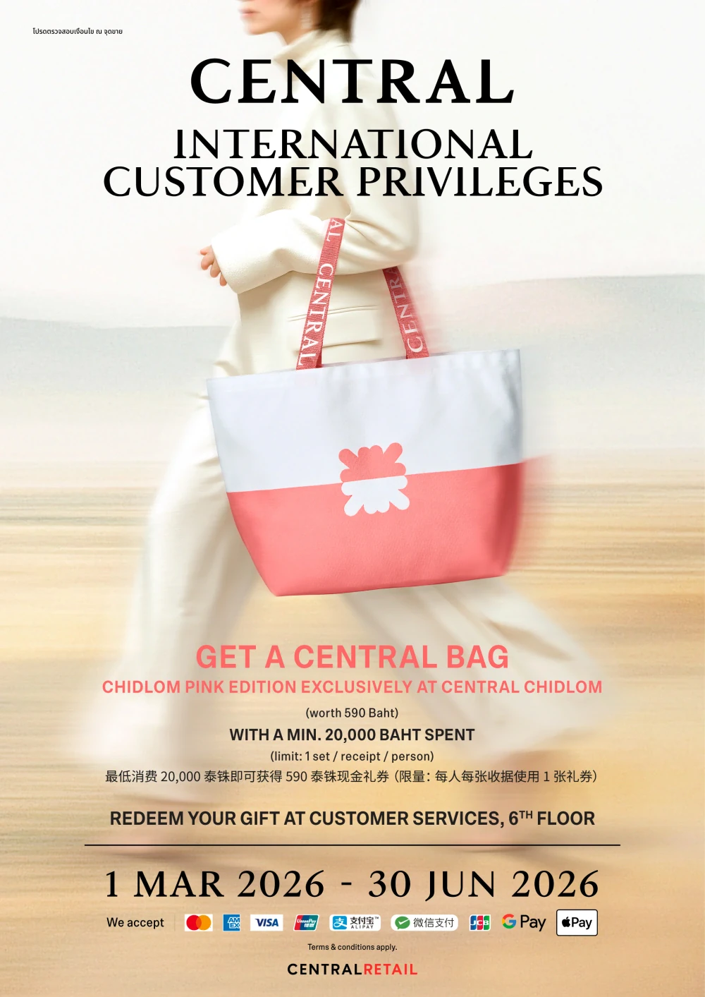 - GET A CENTRAL BAG CHIDLOM PINK EDITION (WORTH 590 BAHT) WITH A MIN. 20,000 BAHT SPENT (LIMIT: 1 SET / RECEIPT / PERSON)